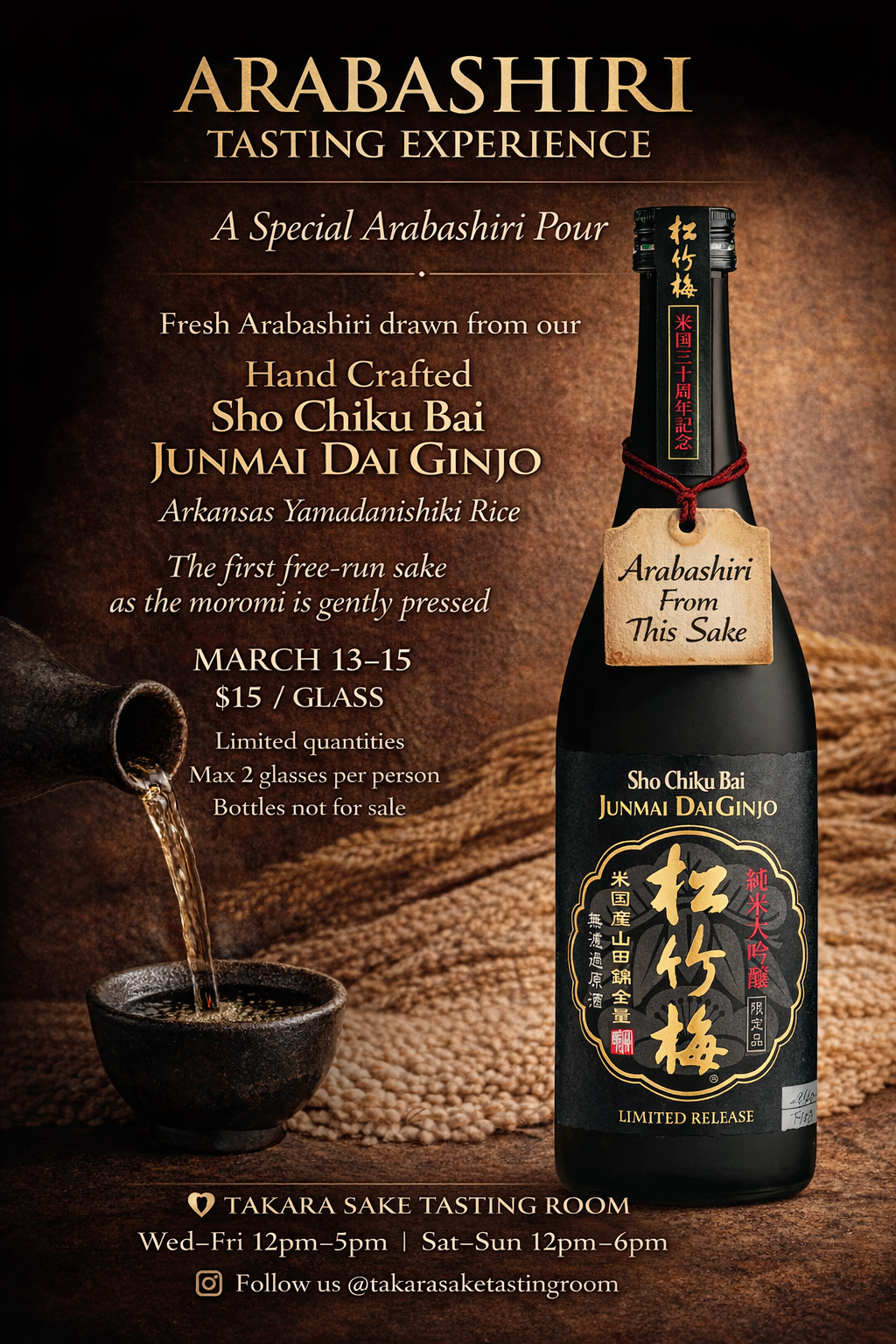 For the first time ever, we are offering a special tasting of fresh Arabashiri drawn from our Sho Chiku Bai Junmai Daiginjo, brewed with Arkansas-grown Yamadanishiki rice.